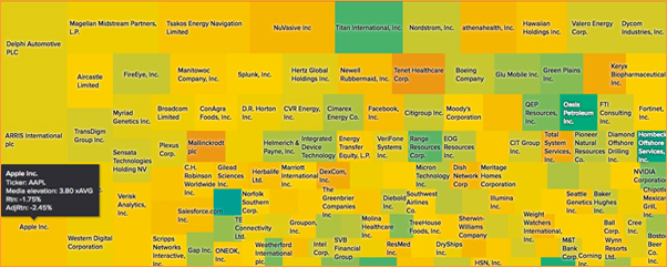 By holding the cursor over a cell, the user obtains the specific values. In the case of Apple, the media coverage has been 3.8 times the average. The stock is down 1.75%, and 2.45% adjusted (S&P 500, beta=1).
