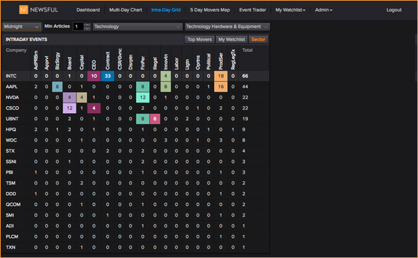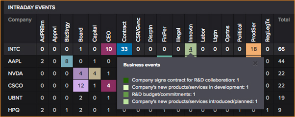 - The Intra-Day Chart Movers grid summarizes recent, current-day business events in a grid format of instruments and main business events classes. Each cell in the grid indicates the number of articles of recent coverage.