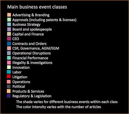 Comvix covers about 3,500 U.S. equities, since 1 January 2014. The business events taxonomy has 450 elements at the granular level and 18 main business event classes, shown below with their respective colors used in the charts.