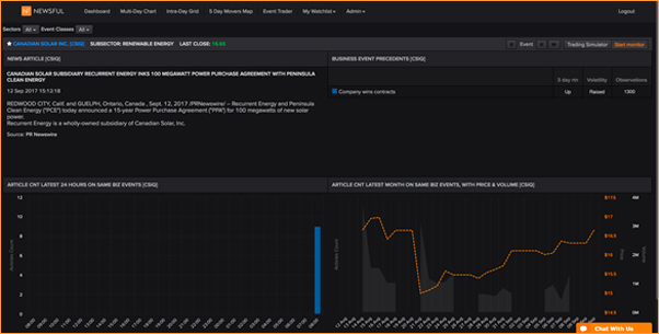 Event Trader consists of four quadrants of information. In the example below, for Canadian Solar, we see news/announcement of an apparently significant contract, for 100 megawatt annually. That’s the top left quadrant. The top right quadrant is the structured event: COMPANY WINS CONTRACT. The top left quadrant tells us the information is pretty fresh. Nine articles in the last hour (08:00 to 09:00 New York time). No coverage before that in the last 24 hours. And no similar events for Canadian Solar in the last month.