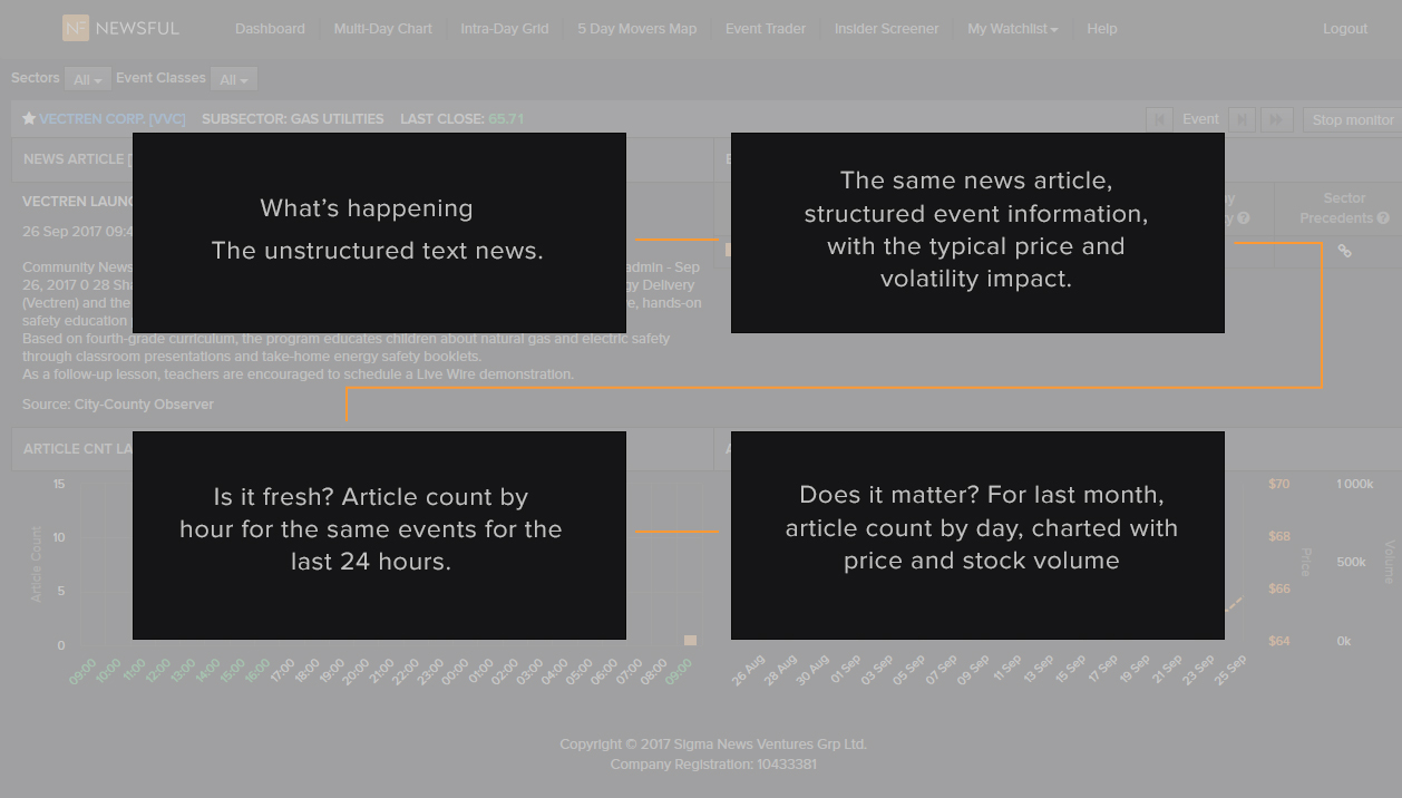 - The bottom right quadrant shows a chart of the number of articles on the same business events over the last month, along with the price-changes and the changes in trading volumes. This often answers the question, Does this matter?