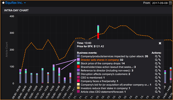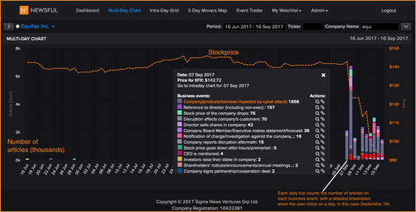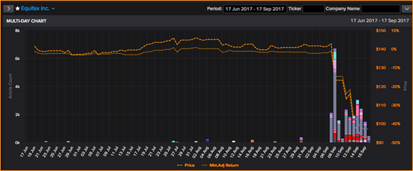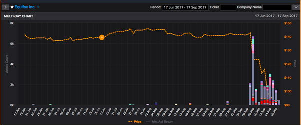 The Multi-Day Chart is a line-chart which shows the stock-price against the right axis. It superimposes as bars the count the number of articles on different business events, against the left axis. In the example below, based on the media coverage of the hacking of Equifax in September 2017, the number of articles is in thousands. Each color represents a class of business event and the legend can be found in the Introduction.